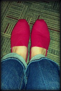Day 280: I wore my new red Toms {another of Sunday’s purchases} for the first time during jeans day Friday. I felt like I was wearing cute bedroom shoes all day. Love them!