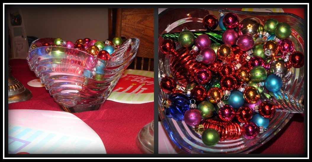 I’ve done this for the past couple of years: place plain, brightly colored ornaments in a pretty crystal bowl.  I first put in large ones, then midsized & finally top it with tiny balls {yes, I did type tiny balls! ha I’m 12!}