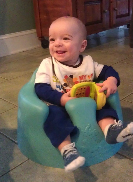 Zach loving the bumbo & the new toy cell phoneHappy bouncing Lucy