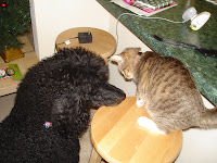 The fourth picture is Bogey meeting my brother’s cat Triumph when Triumph was a kitten. Right after this picture Triumph introduced Bogey to his claws and they chased each other around the apartment. It was funny and cute.Bogey met Moe a few times when my grandparents would pick me up or drop me off while going to or coming from my parent’s house~ but only through a screen door. They weren’t fans of each other.