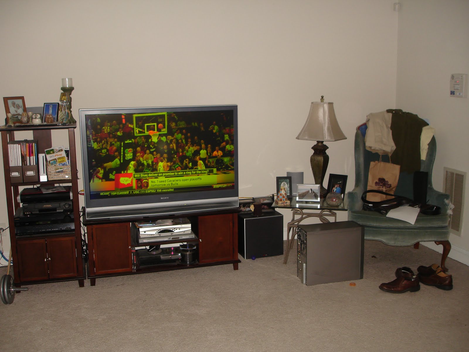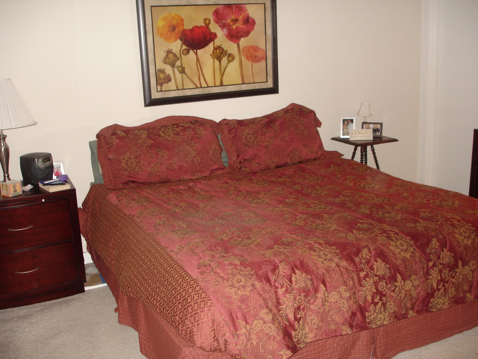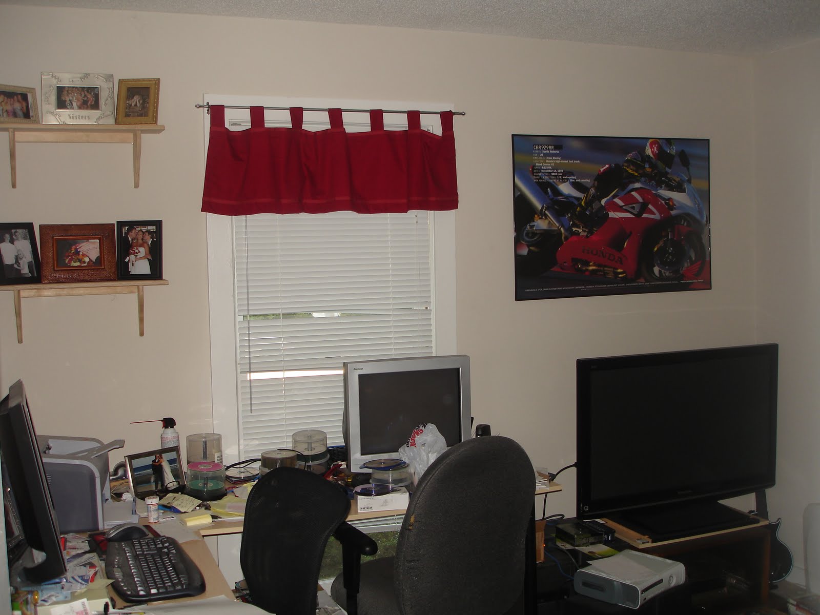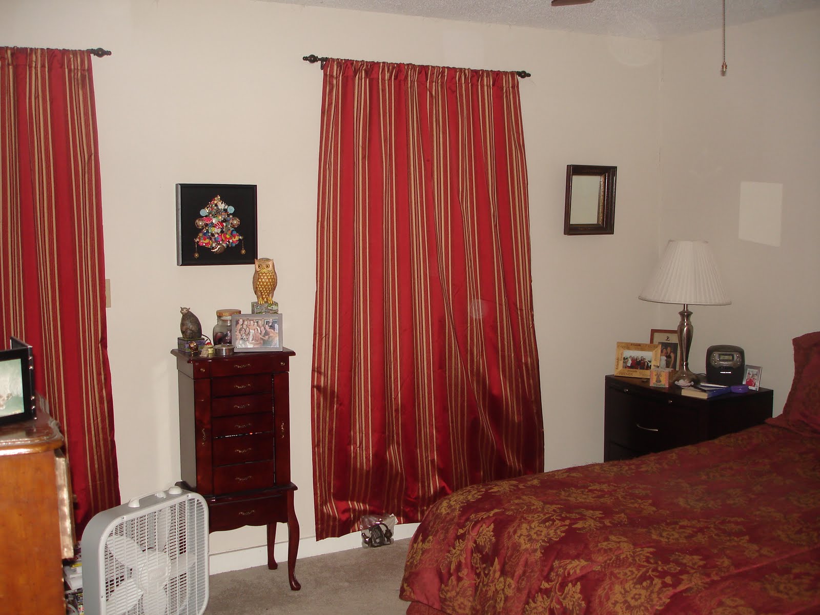Now our bedroom. We’re still working on a headboard~ first couldn’t find one we like, then all too expensive. I think we found one just last week~ my Dad’s cousin offered her extra for $50!! The jewelry tree in between the windows is very special to me. My mom made it out my her mom’s costume jewelry!