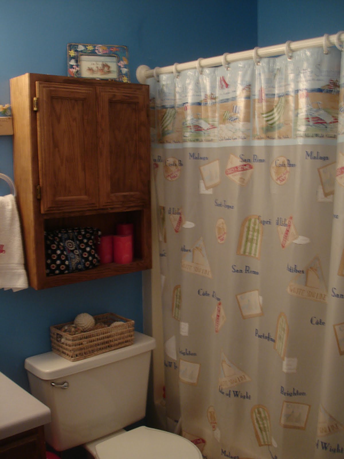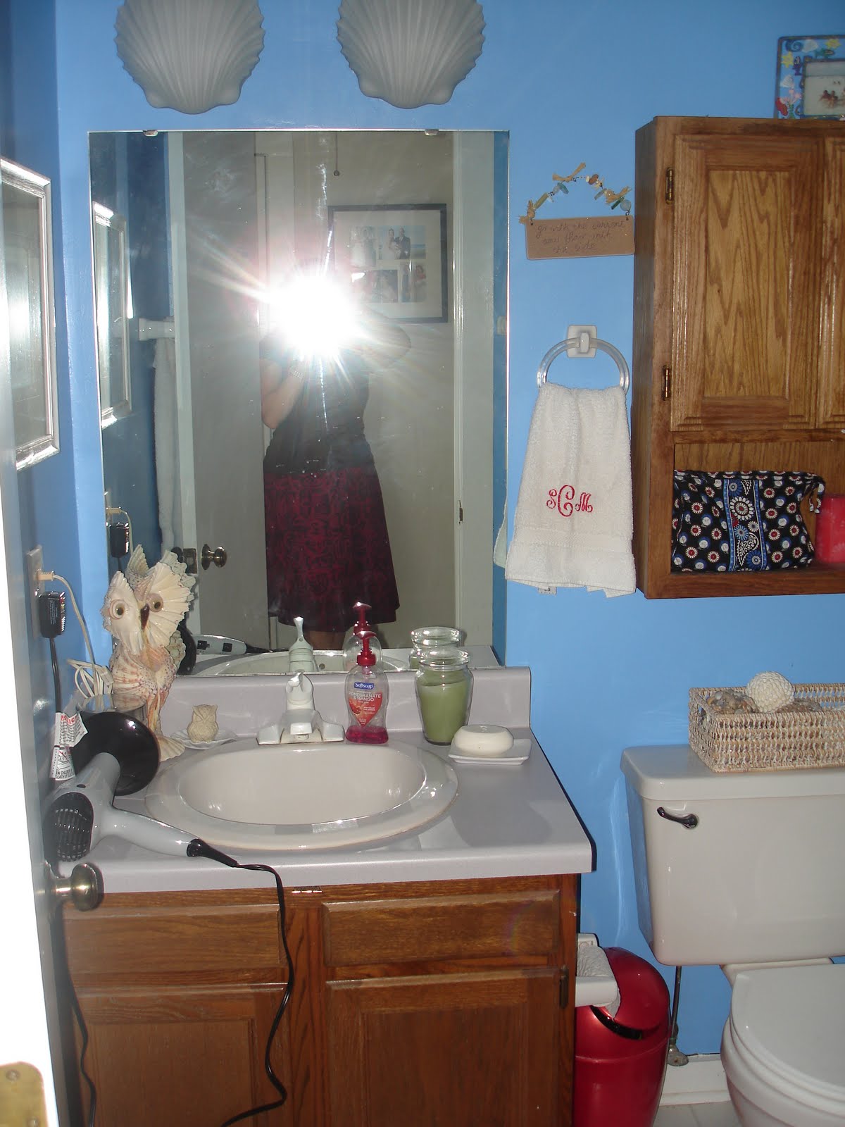 When we moved in, this bathroom was awful! Multiple layers of wallpaper + boarder. The paint turned out brighter than I wanted, but I love how this beachy bathroom has turned out.